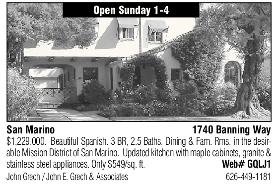 San Marino 1740 Banning Way $1,229,000. Beautiful Spanish. 3 BR, 2.5 Baths, Dining & Fam. Rms. in the desirable Mission District of San Marino. Updated kitchen with maple cabinets, granite & stainless steel appliances. Only $549/sq. ft. Web# GQLJ1 John Grech / John E. Grech & Associates 626-449-1181