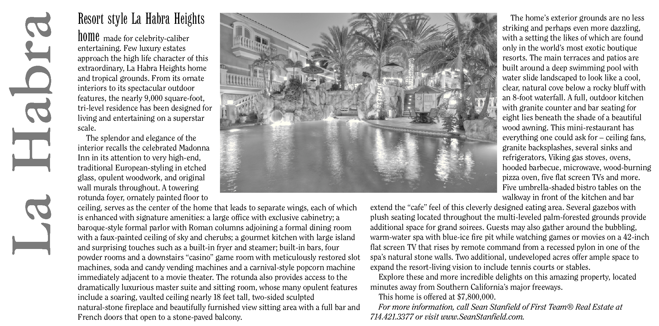 made for celebrity-caliber entertaining. Few luxury estates approach the high life character of this extraordinary, La Habra Heights home and tropical grounds. From its ornate interiors to its spectacular outdoor features, the nearly 9,000 square-foot, tri-level residence has been designed for living and entertaining on a superstar scale.