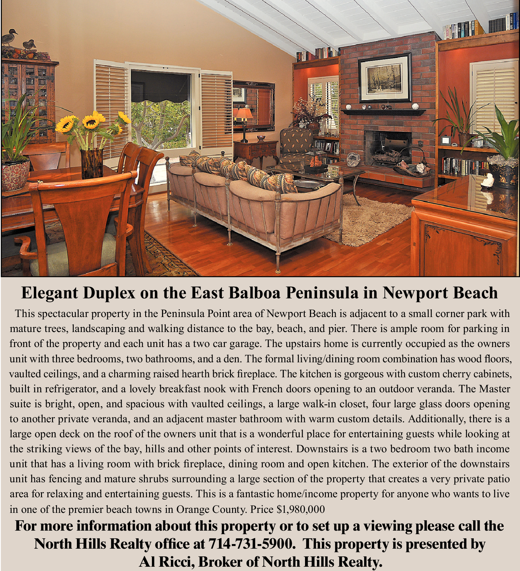 Elegant Duplex on the East Balboa Peninsula in Newport Beach This spectacular property in the Peninsula Point area of Newport Beach is adjacent to a small corner park with mature trees, landscaping and walking distance to the bay, beach, and pier. There is ample room for parking in front of the property and each unit has a two car garage. The upstairs home is currently occupied as the owners unit with three bedrooms, two bathrooms, and a den. The formal living/dining room combination has wood floors, vaulted ceilings, and a charming raised hearth brick fireplace. The kitchen is gorgeous with custom cherry cabinets, built in refrigerator, and a lovely breakfast nook with French doors opening to an outdoor veranda. The Master suite is bright, open, and spacious with vaulted ceilings, a large walk-in closet, four large glass doors opening to another private veranda, and an adjacent master bathroom with warm custom details. Additionally, there is a large open deck on the roof of the owners unit that is a wonderful place for entertaining guests while looking at the striking views of the bay, hills and other points of interest. Downstairs is a two bedroom two bath income unit that has a living room with brick fireplace, dining room and open kitchen. The exterior of the downstairs unit has fencing and mature shrubs surrounding a large section of the property that creates a very private patio area for relaxing and entertaining guests. This is a fantastic home/income property for anyone who wants to live in one of the premier beach towns in Orange County. Price $1,980,000 For more information about this property or to set up a viewing please call the North Hills Realty office at 714-731-5900. This property is presented by Al Ricci, Broker of North Hills Realty.