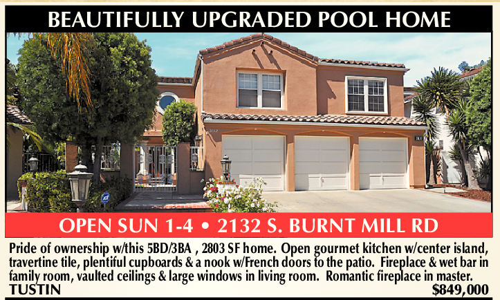 BEAUTIFULLY UPGRADED POOL HOME OPEN SUN 1-4 • 2132 S. BURNT MILL RD Pride of ownership w/this 5BD/3BA , 2803 SF home. Open gourmet kitchen w/center island, travertine tile, plentiful cupboards & a nook w/French doors to the patio. Fireplace & wet bar in family room, vaulted ceilings & large windows in living room. Romantic fireplace in master. TUSTIN $849,000