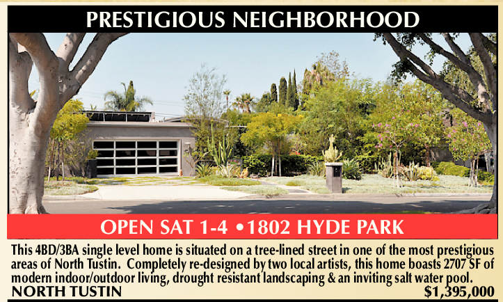 PRESTIGIOUS NEIGHBORHOOD OPEN SAT 1-4 •1802 HYDE PARK This 4BD/3BA single level home is situated on a tree-lined street in one of the most prestigious areas of North Tustin. Completely re-designed by two local artists, this home boasts 2707 SF of modern indoor/outdoor living, drought resistant landscaping & an inviting salt water pool. NORTH TUSTIN $1,395,000
