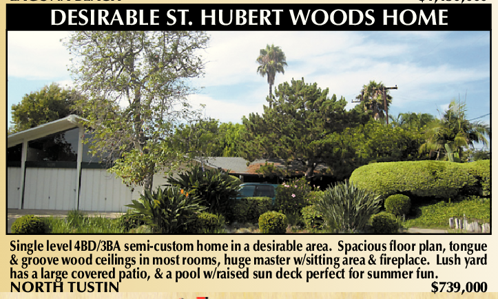 LAGUNA BEACH $1,150,000 DESIRABLE ST. HUBERT WOODS HOME Single level 4BD/3BA semi-custom home in a desirable area. Spacious floor plan, tongue & groove wood ceilings in most rooms, huge master w/sitting area & fireplace. Lush yard has a large covered patio, & a pool w/raised sun deck perfect for summer fun. NORTH TUSTIN $739,000