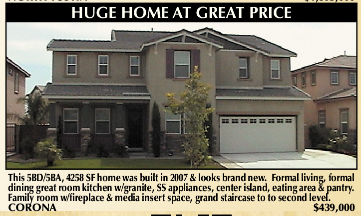 NORTH TUSTIN $1,395,000 HUGE HOME AT GREAT PRICE This 5BD/5BA, 4258 SF home was built in 2007 & looks brand new. Formal living, formal dining great room kitchen w/granite, SS appliances, center island, eating area & pantry. Family room w/fireplace & media insert space, grand staircase to to second level. CORONA $439,000