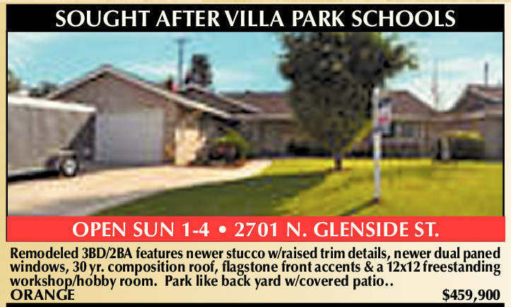 SOUGHT AFTER VILLA PARK SCHOOLS OPEN SUN 1-4 • 2701 N. GLENSIDE ST. Remodeled 3BD/2BA features newer stucco w/raised trim details, newer dual paned windows, 30 yr. composition roof, flagstone front accents & a 12x12 freestanding workshop/hobby room. Park like back yard w/covered patio.. ORANGE $459,900