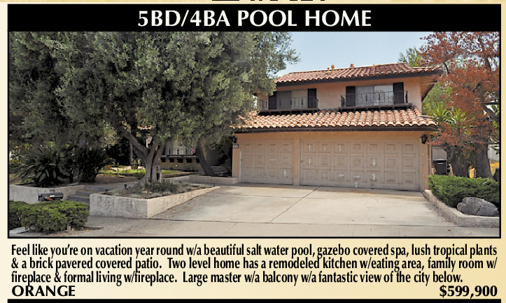 5BD/4BA POOL HOME Feel like you’re on vacation year round w/a beautiful salt water pool, gazebo covered spa, lush tropical plants & a brick pavered covered patio. Two level home has a remodeled kitchen w/eating area, family room w/ fireplace & formal living w/fireplace. Large master w/a balcony w/a fantastic view of the city below. ORANGE $599,900