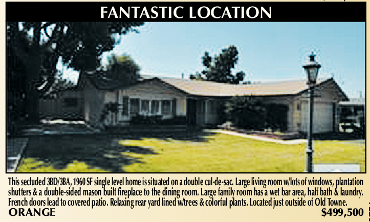 ORANGE $599,900 FANTASTIC LOCATION This secluded 3BD/3BA, 1960 SF single level home is situated on a double cul-de-sac. Large living room w/lots of windows, plantation shutters & a double-sided mason built fireplace to the dining room. Large family room has a wet bar area, half bath & laundry. French doors lead to covered patio. Relaxing rear yard lined w/trees & colorful plants. Located just outside of Old Towne. ORANGE $499,500
