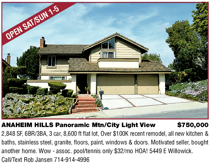 ANAHEIM HILLS Panoramic Mtn/City Light View $750,000 2,848 SF, 6BR/3BA, 3 car, 8,600 ft flat lot, Over $100K recent remodel, all new kitchen & baths, stainless steel, granite, floors, paint, windows & doors. Motivated seller, bought another home. Wow - assoc. pool/tennis only $32/mo HOA! 5449 E Willowick. Call/Text Rob Jansen 714-914-4996