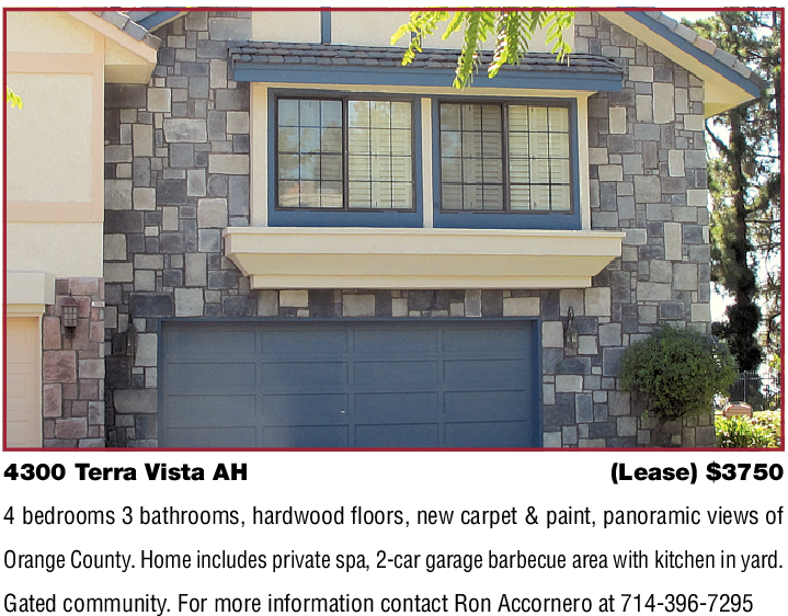 4300 Terra Vista AH (Lease) $3750 4 bedrooms 3 bathrooms, hardwood floors, new carpet & paint, panoramic views of Orange County. Home includes private spa, 2-car garage barbecue area with kitchen in yard. Gated community. For more information contact Ron Accornero at 714-396-7295