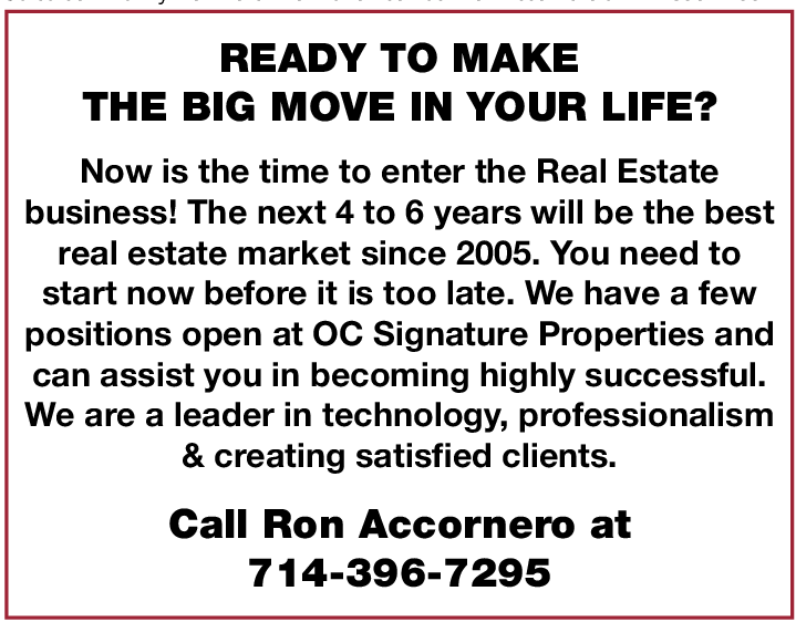 Gated community. For more information contact Ron Accornero at 714-396-7295 READY TO MAKE THE BIG MOVE IN YOUR LIFE? Now is the time to enter the Real Estate business! The next 4 to 6 years will be the best real estate market since 2005. You need to start now before it is too late. We have a few positions open at OC Signature Properties and can assist you in becoming highly successful. We are a leader in technology, professionalism & creating satisfied clients. Call Ron Accornero at 714-396-7295