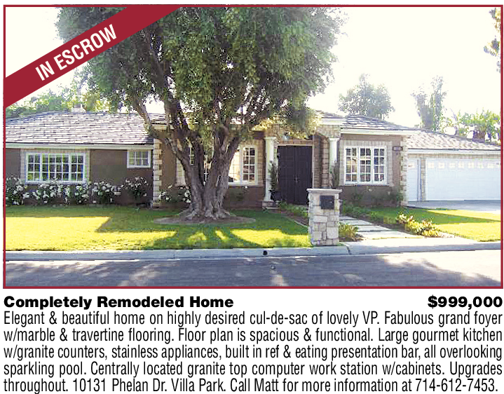 Call/Text Rob Jansen 714-914-4996. Completely Remodeled Home $999,000 Elegant & beautiful home on highly desired cul-de-sac of lovely VP. Fabulous grand foyer w/marble & travertine flooring. Floor plan is spacious & functional. Large gourmet kitchen w/granite counters, stainless appliances, built in ref & eating presentation bar, all overlooking sparkling pool. Centrally located granite top computer work station w/cabinets. Upgrades throughout. 10131 Phelan Dr. Villa Park. Call Matt for more information at 714-612-7453.
