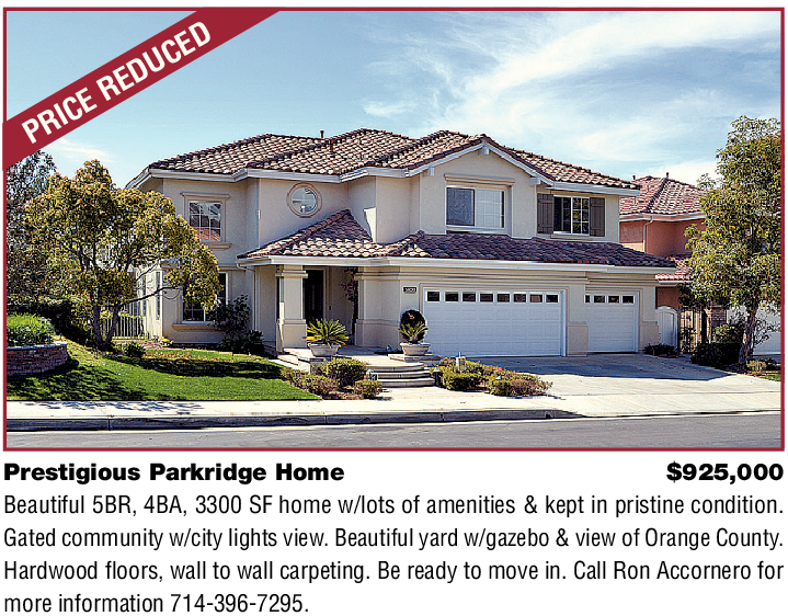 Prestigious Parkridge Home $925,000 Beautiful 5BR, 4BA, 3300 SF home w/lots of amenities & kept in pristine condition. Gated community w/city lights view. Beautiful yard w/gazebo & view of Orange County. Hardwood floors, wall to wall carpeting. Be ready to move in. Call Ron Accornero for more information 714-396-7295.