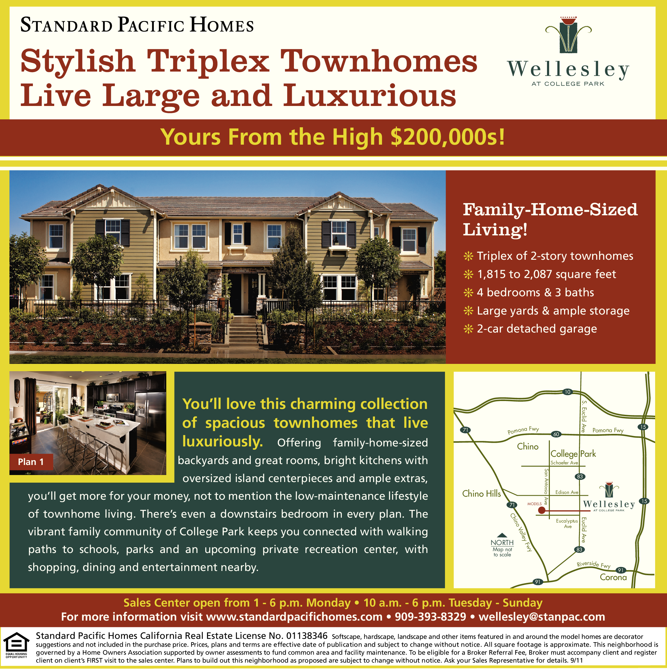 Sales Center open from 1 - 6 p.m. Monday • 10 a.m. - 6 p.m. Tuesday - Sunday For more information visit www.standardpacifichomes.com • 909-393-8329 • wellesley@stanpac.com