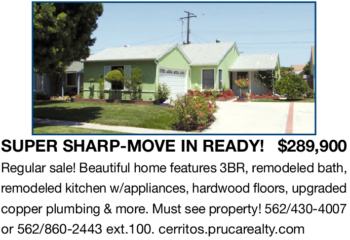SUPER SHARP-MOVE IN READY! $289,900 Regular sale! Beautiful home features 3BR, remodeled bath, remodeled kitchen w/appliances, hardwood floors, upgraded copper plumbing & more. Must see property! 562/430-4007 or 562/860-2443 ext.100. cerritos.prucarealty.com