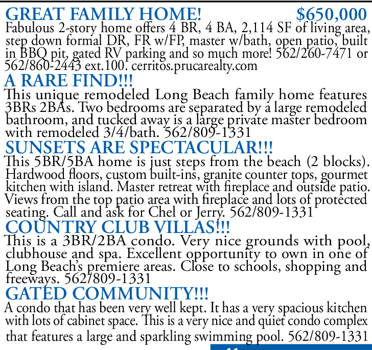 GREAT FAMILY HOME! $650,000 Fabulous 2-story home offers 4 BR, 4 BA, 2,114 SF of living area, step down formal DR, FR w/FP, master w/bath, open patio, built in BBQ pit, gated RV parking and so much more! 562/260-7471 or 562/860-2443 ext.100. cerritos.prucarealty.com A RARE FIND!!! This unique remodeled Long Beach family home features 3BRs 2BAs. Two bedrooms are separated by a large remodeled bathroom, and tucked away is a large private master bedroom with remodeled 3/4/bath. 562/809-1331 SUNSETS ARE SPECTACULAR!!!