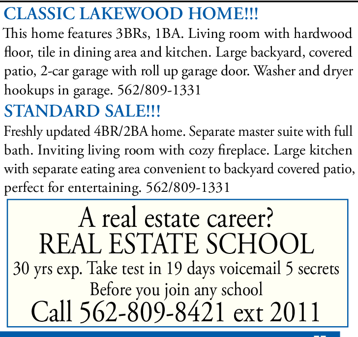 A real estate career? REAL ESTATE SCHOOL 30 yrs exp. Take test in 19 days voicemail 5 secrets Before you join any school Call 562-809-8421 ext 2011 CLASSIC LAKEWOOD HOME!!! This home features 3BRs, 1BA. Living room with hardwood floor, tile in dining area and kitchen. Large backyard, covered patio, 2-car garage with roll up garage door. Washer and dryer hookups in garage. 562/809-1331 STANDARD SALE!!! Freshly updated 4BR/2BA home. Separate master suite with full bath. Inviting living room with cozy fireplace. Large kitchen with separate eating area convenient to backyard covered patio, perfect for entertaining. 562/809-1331