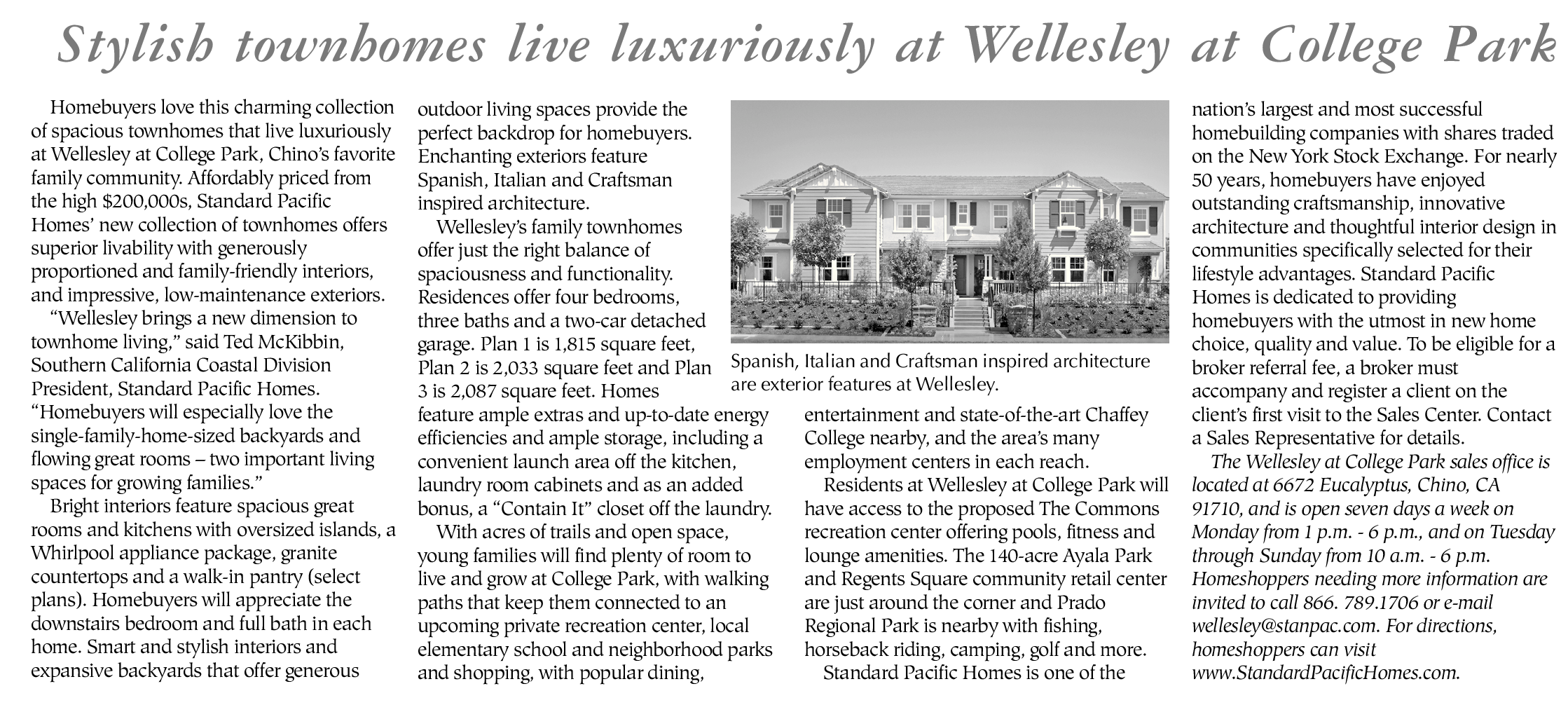 The Wellesley at College Park sales office is located at 6672 Eucalyptus, Chino, CA 91710, and is open seven days a week on Monday from 1 p.m. - 6 p.m., and on Tuesday through Sunday from 10 a.m. - 6 p.m. Homeshoppers needing more information are invited to call 866. 789.1706 or e-mail wellesley@stanpac.com. For directions, homeshoppers can visit www.StandardPacificHomes.com.
