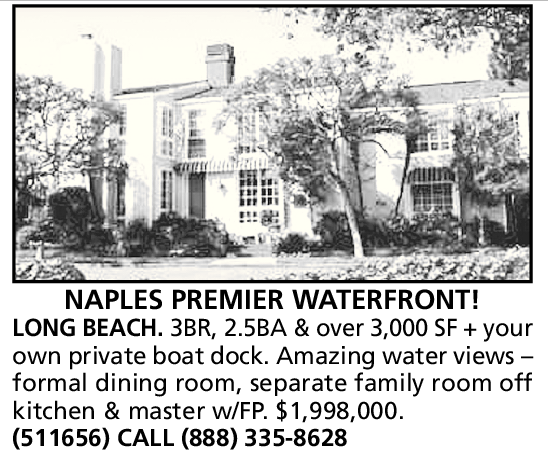 LONG BEACH. 3BR, 2.5BA & over 3,000 SF + your own private boat dock. Amazing water views – formal dining room, separate family room off kitchen & master w/FP. $1,998,000. (511656) CALL (888) 335-8628