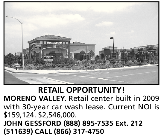MORENO VALLEY. Retail center built in 2009 with 30-year car wash lease. Current NOI is $159,124. $2,546,000. JOHN GESSFORD (888) 895-7535 Ext. 212 (511639) CALL (866) 317-4750