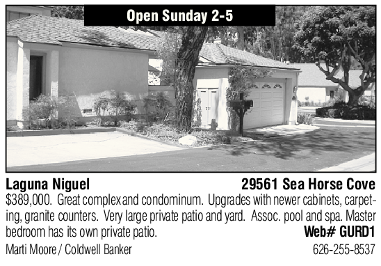 Open Sunday 2-5 Laguna Niguel 29561 Sea Horse Cove $389,000. Great complex and condominum. Upgrades with newer cabinets, carpeting, granite counters. Very large private patio and yard. Assoc. pool and spa. Master bedroom has its own private patio. Web# GURD1 Marti Moore / Coldwell Banker 626-255-8537 See also