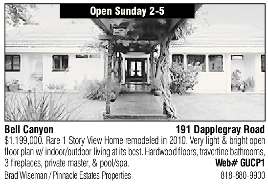 $1,199,000. Rare 1 Story View Home remodeled in 2010. Very light & bright open 3 fireplaces, private master, & pool/spa. Web# GUCP1 Brad Wiseman / Pinnacle Estates Properties 818-880-9900