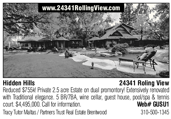 www.24341RollingView.com Hidden Hills 24341 Roling View Reduced $755k! Private 2.5 acre Estate on dual promontory! Extensively renovated with Traditional elegance. 5 BR/7BA, wine cellar, guest house, pool/spa & tennis court. $4,495,000. Call for information. Web# GUSU1 Tracy Tutor Maltas / Partners Trust Real Estate Brentwood 310-500-1345