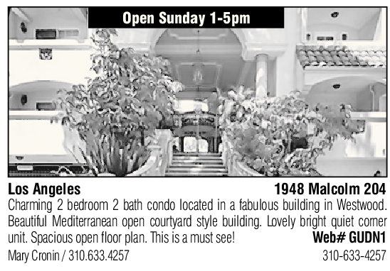 Open Sunday 1-5pm Los Angeles 1948 Malcolm 204 Charming 2 bedroom 2 bath condo located in a fabulous building in Westwood. Beautiful Mediterranean open courtyard style building. Lovely bright quiet corner unit. Spacious open floor plan. This is a must see! Web# GUDN1 Mary Cronin / 310.633.4257 310-633-4257