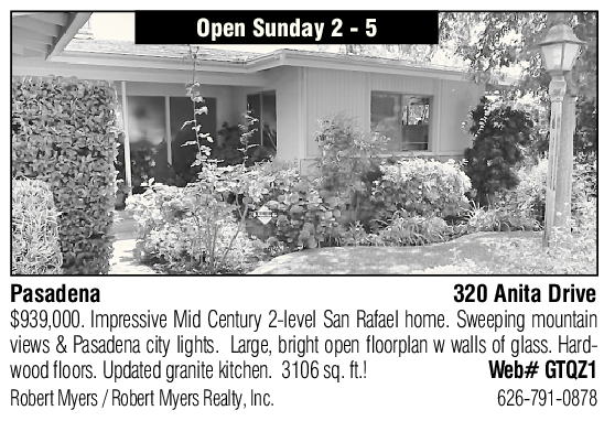 Open Sunday 2 - 5 Pasadena 320 Anita Drive $939,000. Impressive Mid Century 2-level San Rafael home. Sweeping mountain views & Pasadena city lights. Large, bright open floorplan w walls of glass. Hardwood floors. Updated granite kitchen. 3106 sq. ft.! Web# GTQZ1 Robert Myers / Robert Myers Realty, Inc. 626-791-0878 See also