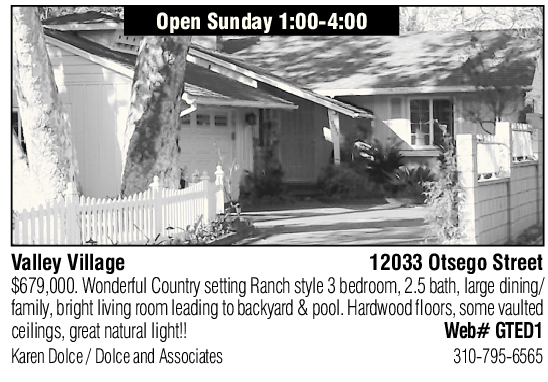 Open Sunday 1:00-4:00 Valley Village 12033 Otsego Street family, bright living room leading to backyard & pool. Hardwood floors, some vaulted $679,000. Wonderful Country setting Ranch style 3 bedroom, 2.5 bath, large dining/ ceilings, great natural light!! Web# GTED1 Karen Dolce / Dolce and Associates 310-795-6565