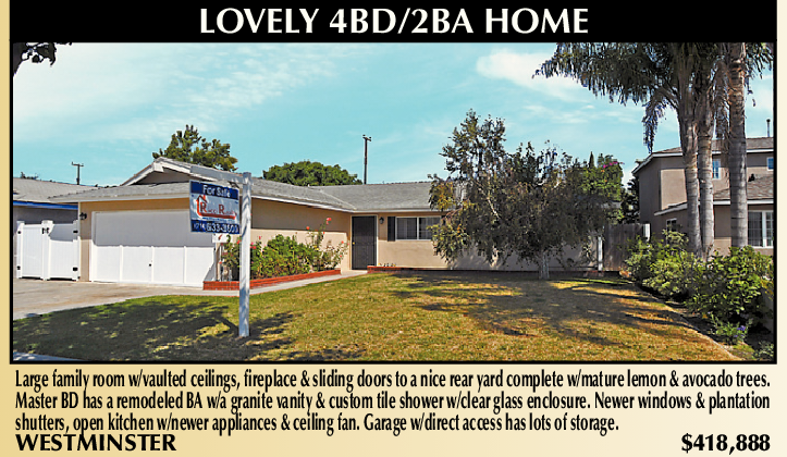 LOVELY 4BD/2BA HOME Large family room w/vaulted ceilings, fireplace & sliding doors to a nice rear yard complete w/mature lemon & avocado trees. Master BD has a remodeled BA w/a granite vanity & custom tile shower w/clear glass enclosure. Newer windows & plantation shutters, open kitchen w/newer appliances & ceiling fan. Garage w/direct access has lots of storage. WESTMINSTER $418,888