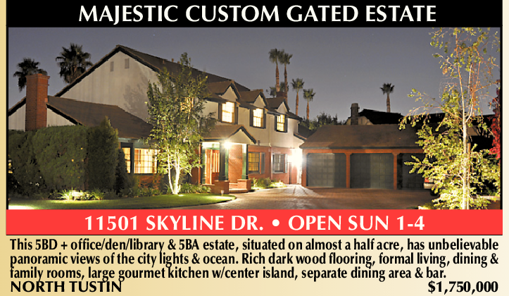 This 5BD + office/den/library & 5BA estate, situated on almost a half acre, has unbelievable panoramic views of the city lights & ocean. Rich dark wood flooring, formal living, dining & family rooms, large gourmet kitchen w/center island, separate dining area & bar. NORTH TUSTIN $1,750,000