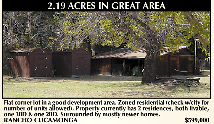 Flat corner lot in a good development area. Zoned residential (check w/city for number of units allowed). Property currently has 2 residences, both livable, one 3BD & one 2BD. Surrounded by mostly newer homes. RANCHO CUCAMONGA $599,000