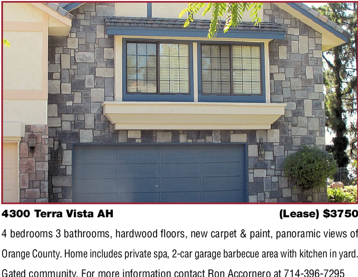 4300 Terra Vista AH (Lease) $3750 4 bedrooms 3 bathrooms, hardwood floors, new carpet & paint, panoramic views of Orange County. Home includes private spa, 2-car garage barbecue area with kitchen in yard. Gated community. For more information contact Ron Accornero at 714-396-7295