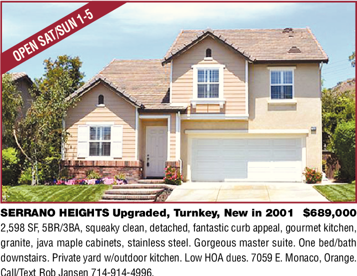 SERRANO HEIGHTS Upgraded, Turnkey, New in 2001 $689,000 2,598 SF, 5BR/3BA, squeaky clean, detached, fantastic curb appeal, gourmet kitchen, granite, java maple cabinets, stainless steel. Gorgeous master suite. One bed/bath downstairs. Private yard w/outdoor kitchen. Low HOA dues. 7059 E. Monaco, Orange. Call/Text Rob Jansen 714-914-4996.