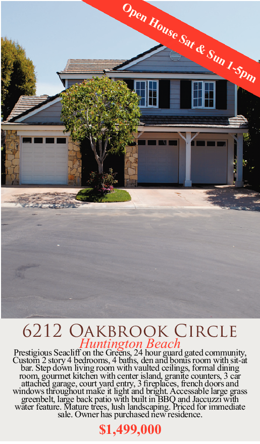 6212 Oakbrook Circle Huntington Beach Prestigious Seacliff on the Greens, 24 hour guard gated community, Custom 2 story 4 bedrooms, 4 baths, den and bonus room with sit-at bar. Step down living room with vaulted ceilings, formal dining room, gourmet kitchen with center island, granite counters, 3 car attached garage, court yard entry, 3 fireplaces, french doors and windows throughout make it light and bright. Accessable large grass greenbelt, large back patio with built in BBQ and Jaccuzzi with water feature. Mature trees, lush landscaping. Priced for immediate sale. Owner has purchased new residence. $1,499,000