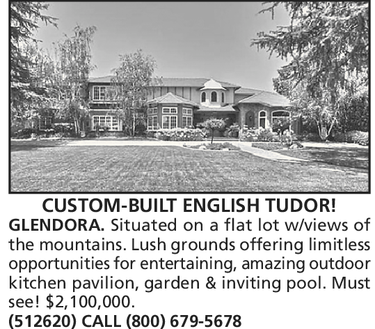 CUSTOM-BUILT ENGLISH TUDOR! GLENDORA. Situated on a flat lot w/views of the mountains. Lush grounds offering limitless opportunities for entertaining, amazing outdoor kitchen pavilion, garden & inviting pool. Must see! $2,100,000. (512620) CALL (800) 679-5678