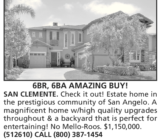 6BR, 6BA AMAZING BUY! SAN CLEMENTE. Check it out! Estate home in the prestigious community of San Angelo. A magnificent home w/high quality upgrades throughout & a backyard that is perfect for entertaining! No Mello-Roos. $1,150,000. (512610) CALL (800) 387-1454