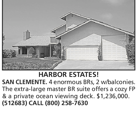 SAN CLEMENTE. 4 enormous BRs, 2 w/balconies. The extra-large master BR suite offers a cozy FP & a private ocean viewing deck. $1,236,000. (512683) CALL (800) 258-7630