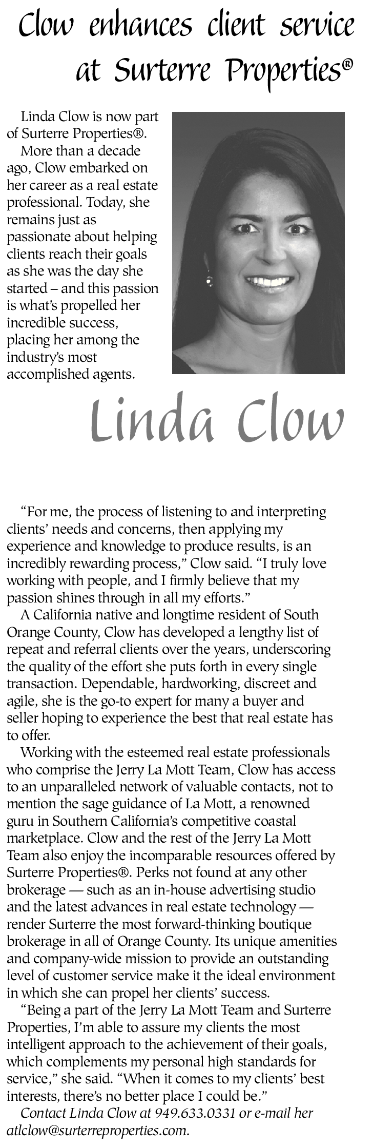 Working with the esteemed real estate professionals who comprise the Jerry La Mott Team, Clow has access to an unparalleled network of valuable contacts, not to mention the sage guidance of La Mott, a renowned guru in Southern California’s competitive coastal marketplace. Clow and the rest of the Jerry La Mott Team also enjoy the incomparable resources offered by Surterre Properties®. Perks not found at any other brokerage — such as an in-house advertising studio and the latest advances in real estate technology — render Surterre the most forward-thinking boutique brokerage in all of Orange County. Its unique amenities and company-wide mission to provide an outstanding level of customer service make it the ideal environment in which she can propel her clients’ success.