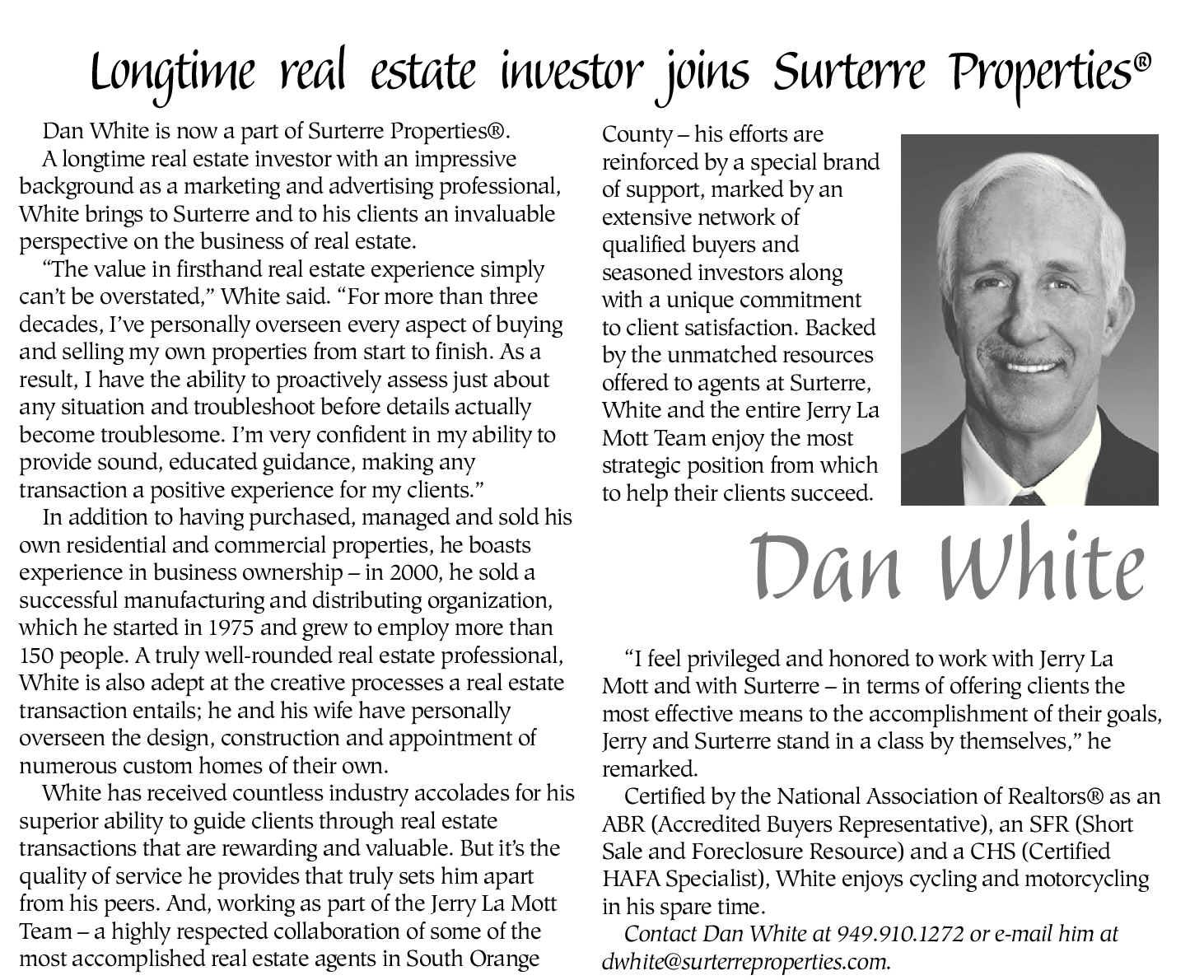 Contact Dan White at 949.910.1272 or e-mail him at dwhite@surterreproperties.com.