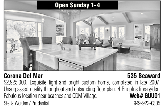 Corona Del Mar 535 Seaward $2,925,000. Exquisite light and bright custom home, completed in late 2007. Unsurpassed quality throughout and outsanding floor plan. 4 Brs plus library/den. Fabulous location near beaches and CDM Village. Web# GUUO1 Stella Worden / Prudential 949-922-0305