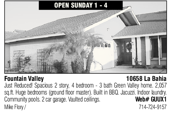 Fountain Valley 10658 La Bahia Just Reduced! Spacious 2 story, 4 bedroom - 3 bath Green Valley home. 2,057 sq.ft. Huge bedrooms (ground floor master). Built in BBQ. Jacuzzi. Indoor laundry. Community pools. 2 car garage. Vaulted ceilings. Web# GUUX1 Mike Flory / 714-724-9157