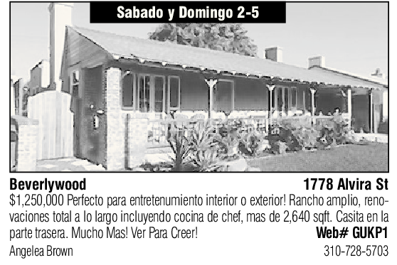 Beverlywood 1778 Alvira St $1,250,000 Perfecto para entretenumiento interior o exterior! Rancho amplio, renovaciones total a lo largo incluyendo cocina de chef, mas de 2,640 sqft. Casita en la parte trasera. Mucho Mas! Ver Para Creer! Web# GUKP1 Angelea Brown 310-728-5703