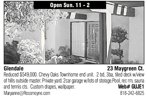 Glendale 23 Maygreen Ct. Reduced $549,000. Chevy Oaks Townhome end unit. 2 bd, 3ba, tiled deck w/view of hills outside master. Private yard. 2car garage w/lots of storage.Pool, rec rm, sauna and tennis cts. Custom drapes, wallpaper. Web# GUJE1 Maryanne@Rossmoyne.com 818-242-6825