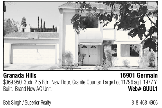 Granada Hills 16901 Germain $369,950. 3bdr. 2.5 Bth. New Floor, Granite Counter. Large Lot 11796 sqft. 1977 Yr Built. Brand New AC Unit. Web# GUUL1 Bob Singh / Superior Realty 818-468-4906