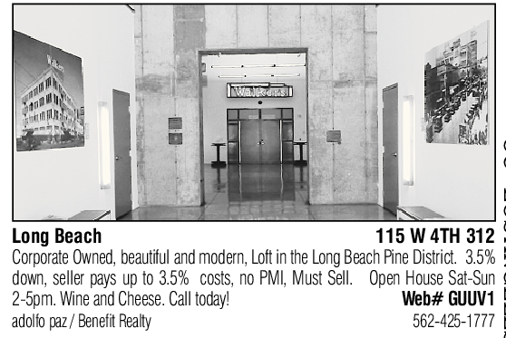 Long Beach 115 W 4TH 312 Corporate Owned, beautiful and modern, Loft in the Long Beach Pine District. 3.5% down, seller pays up to 3.5% costs, no PMI, Must Sell. Open House Sat-Sun 2-5pm. Wine and Cheese. Call today! Web# GUUV1 adolfo paz / Benefit Realty 562-425-1777