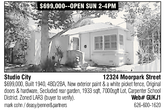 Studio City 12324 Moorpark Street $699,000, Built 1940, 4BD/2BA, New exterior paint & a white picket fence, Original doors & hardware, Secluded rear garden, 1933 sqft, 7000sgft Lot, Carpenter School District. Zoned LAR3 (buyer to verify). Web# GUKJ1 mark cohn / deasy/penner&partners 626-600-1620