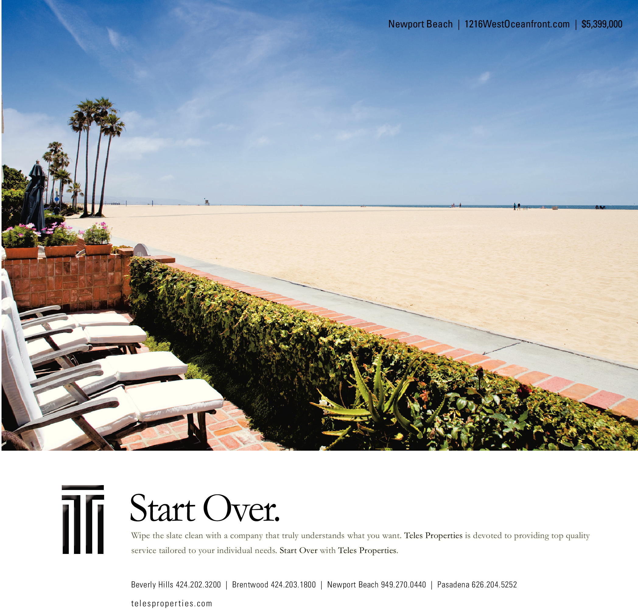 Start Over. Wipe the slate clean with a company that truly understands what you want. Teles Properties is devoted to providing top quality service tailored to your individual needs. Start Over with Teles Properties. Beverly Hills 424.202.3200 | Brentwood 424.203.1800 | Newport Beach 949.270.0440 | Pasadena 626.204.5252 telesproperties.com Newport Beach | 1216WestOceanfront.com | $5,399,000