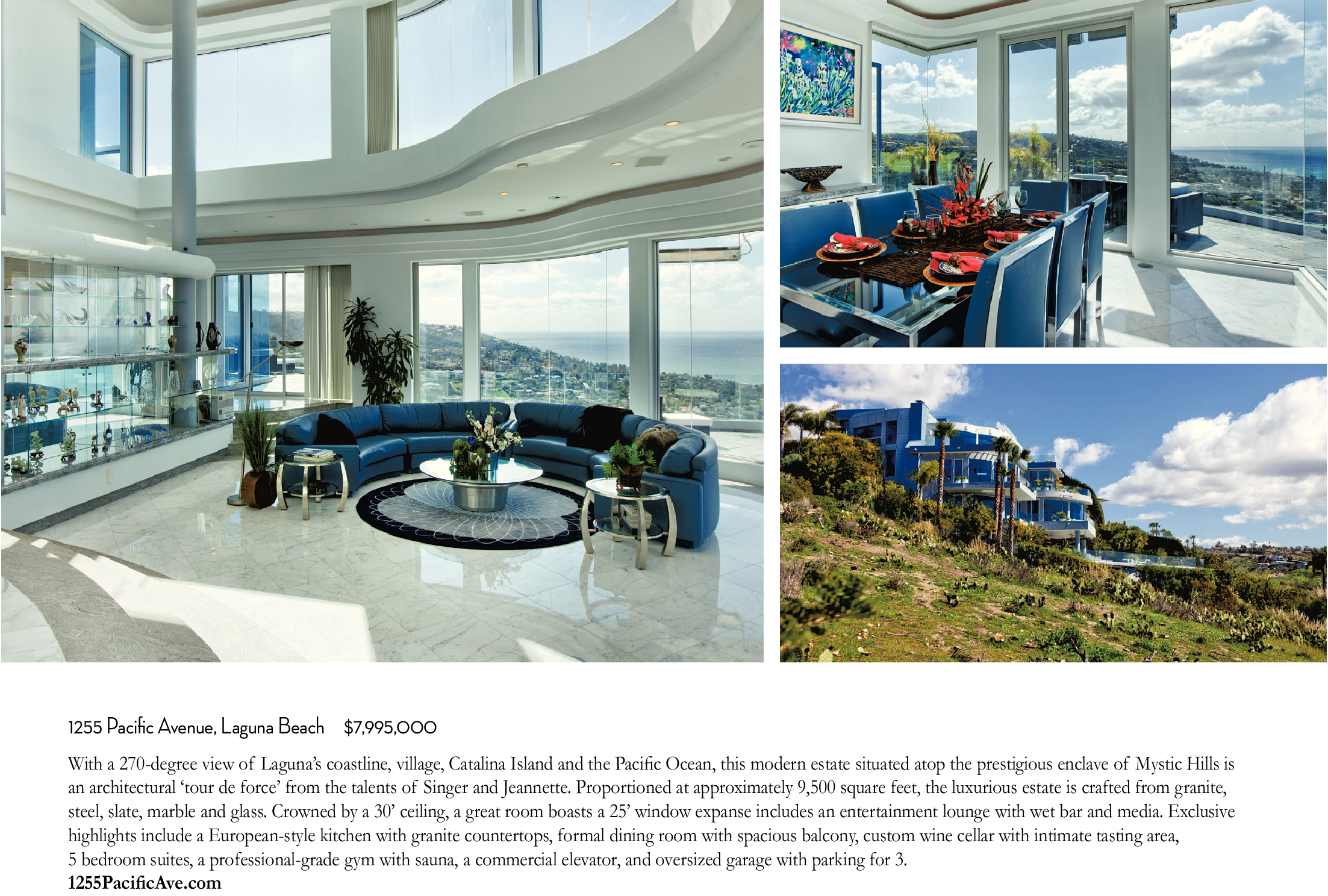 1255 Pacific Avenue, Laguna Beach $7,995,000 With a 270-degree view of Laguna’s coastline, village, Catalina Island and the Pacific Ocean, this modern estate situated atop the prestigious enclave of Mystic Hills is an architectural ‘tour de force’ from the talents of Singer and Jeannette. Proportioned at approximately 9,500 square feet, the luxurious estate is crafted from granite, steel, slate, marble and glass. Crowned by a 30’ ceiling, a great room boasts a 25’ window expanse includes an entertainment lounge with wet bar and media. Exclusive highlights include a European-style kitchen with granite countertops, formal dining room with spacious balcony, custom wine cellar with intimate tasting area, 5 bedroom suites, a professional-grade gym with sauna, a commercial elevator, and oversized garage with parking for 3. 1255PacificAve.com