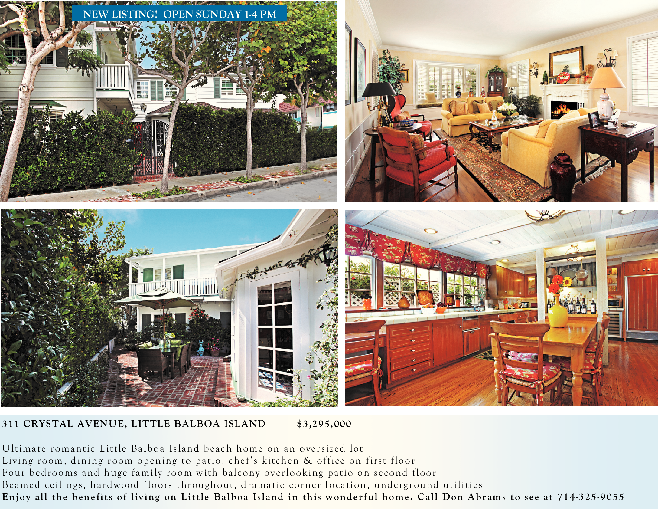 NEW LISTING! OPEN SUNDAY 1-4 PM 311 CRYSTAL AVENUE, LITTLE BALBOA ISLAND $3,295,000 Ultimate romantic Little Balboa Island beach home on an oversized lot Living room, dining room opening to patio, chef’s kitchen & office on first floor Four bedrooms and huge family room with balcony overlooking patio on second floor Beamed ceilings, hardwood floors throughout, dramatic corner location, underground utilities Enjoy all the benefits of living on Little Balboa Island in this wonderful home. Call Don Abrams to see at 714-325-9055 See also