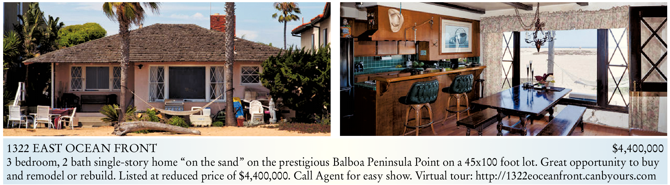1322 EAST OCEAN FRONT $4,400,000 3 bedroom, 2 bath single-story home “on the sand” on the prestigious Balboa Peninsula Point on a 45x100 foot lot. Great opportunity to buy and remodel or rebuild. Listed at reduced price of $4,400,000. Call Agent for easy show. Virtual tour: http://1322eoceanfront.canbyours.com